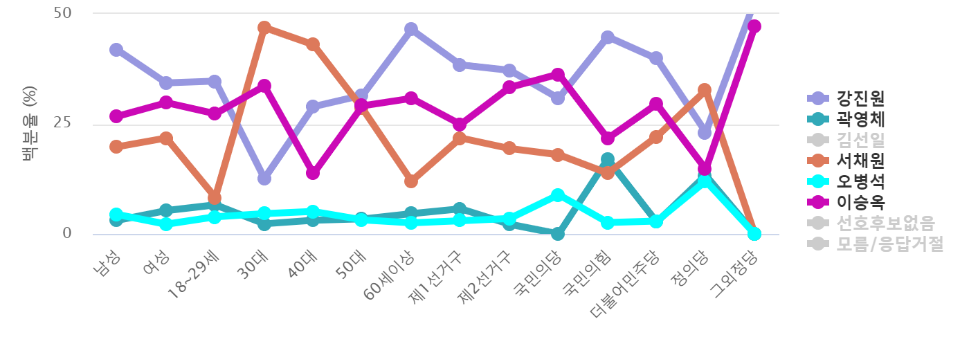 ¿¬·É´ëº° ÁöÁöµµ ºÐ¼®¿¡¼ "°Áø¿ø" È帴 60¼¼ÀÌ»ó(46.4%), 18~29¼¼(34.7%), 50´ë(31.5%), ¿¬·É´ë ¼øÀ¸·Î, "°û¿µÃ¼" È帴 18~29¼¼(6.6%), 60¼¼ÀÌ»ó(4.6%), 50´ë(3.4%), ¿¬·É´ë ¼øÀ¸·Î, "±è¼±ÀÏ" È帴 60¼¼ÀÌ»ó(1.4%), 50´ë(1.1%), ¿¬·É´ë ¼øÀ¸·Î, "¼Ã¤¿ø" È帴 30´ë(46.9%), 40´ë(43%), 50´ë(28.5%), ¿¬·É´ë ¼øÀ¸·Î, "¿Àº´¼®" È帴 40´ë(5.1%), 30´ë(4.6%), 18~29¼¼(3.9%), ¿¬·É´ë ¼øÀ¸·Î, "À̽¿Á" È帴 30´ë(33.6%), 60¼¼ÀÌ»ó(30.8%), 50´ë(29.1%), ¿¬·É´ë ¼øÀ¸·Î °¼¼¸¦ º¸ÀÌ´Â °ÍÀ¸·Î ³ªÅ¸³µ´Ù.