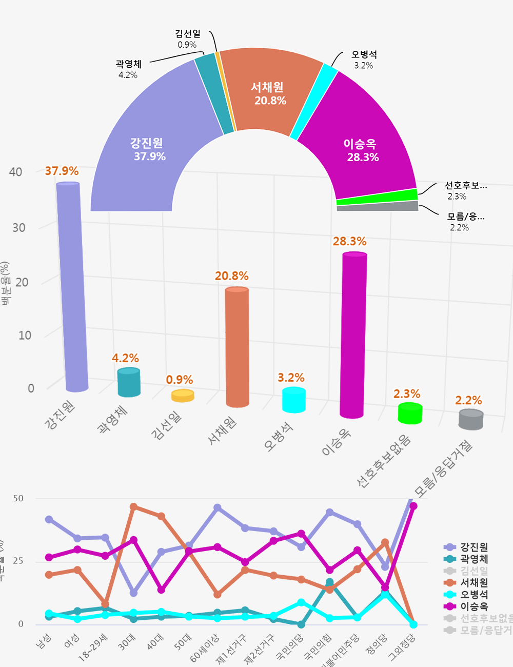 ¼ºº° ÁöÁöµµ ºÐ¼®¿¡¼ "°Áø¿ø" È帴 ³²¼º(41.8%), ¿©¼º(34.3%)¼øÀ¸·Î, "°û¿µÃ¼" È帴 ¿©¼º(5.3%), ³²¼º(3.1%)¼øÀ¸·Î, "±è¼±ÀÏ" È帴 ³²¼º(1.2%), ¿©¼º(0.7%)¼øÀ¸·Î, "¼Ã¤¿ø" È帴 ¿©¼º(21.8%), ³²¼º(19.8%)¼øÀ¸·Î, "¿Àº´¼®" È帴 ³²¼º(4.4%), ¿©¼º(2.2%)¼øÀ¸·Î, "À̽¿Á" È帴 ¿©¼º(29.8%), ³²¼º(26.7%)¼øÀ¸·Î °¼¼¸¦ º¸ÀÌ´Â °ÍÀ¸·Î ³ªÅ¸³µ´Ù.