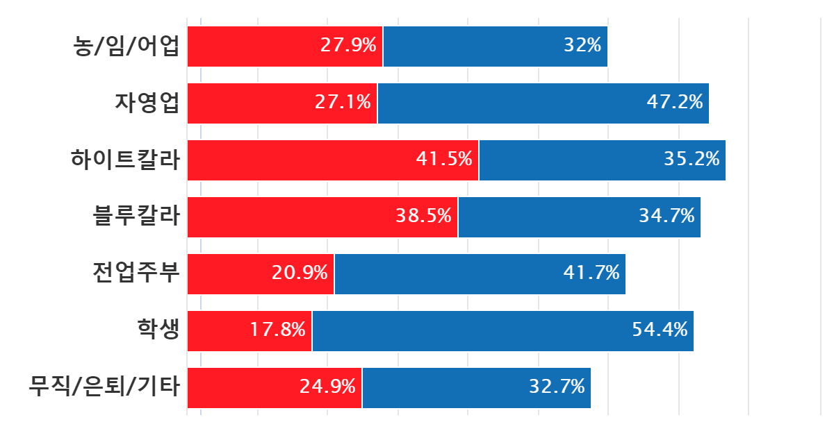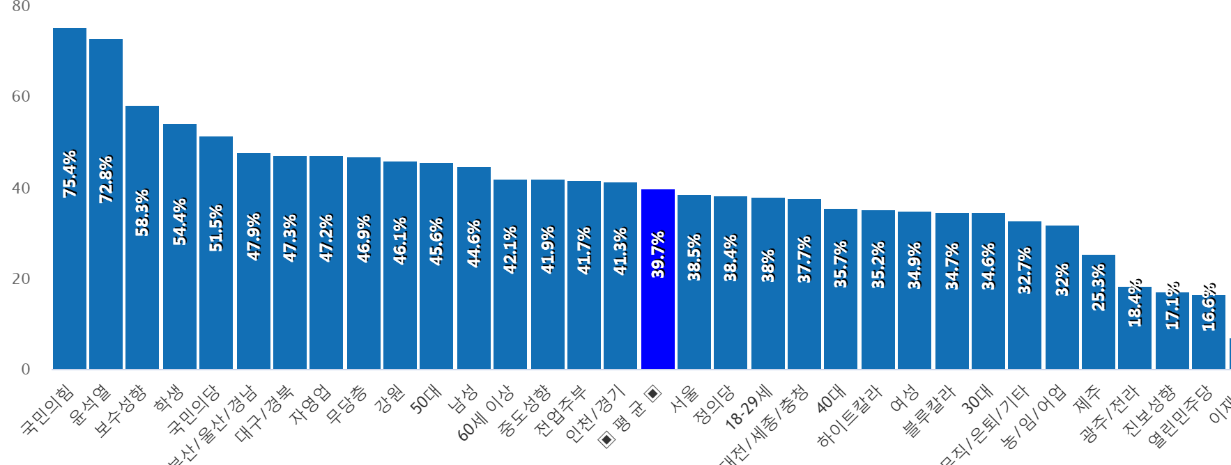 ±¹¹ÎÀÇÈû ÁöÁöÃþ¿¡¼ 75%·Î °¡Àå ³ô°Ô ³ªÅ¸³µÀ¸¸ç, µÚ¸¦ À̾î À±¼®¿ ÁöÁöÃþ 73%, º¸¼ö¼ºÇâ 58%, Çлý 54%, ±¹¹ÎÀÇ´ç 52%, ºÎ»ê/¿ï»ê/°æ³² 48%, ´ë±¸/°æºÏ 47%, ÀÚ¿µ¾÷ 47%, ¹«´çÃþ 47%, °¿ø 46%, 50´ë 46%, ³²¼º 45%, 60¼¼ ÀÌ»ó 42%, Áßµµ¼ºÇâ 42%, Àü¾÷ÁֺΠ42%, ÀÎõ/°æ±â 41% µîÀÇ ¼øÀ¸·Î ´õºÒ¾î¹ÎÁÖ´çÀ» ±âÇÇÁ¤´çÀ¸·Î ²Å¾Ò´Ù.